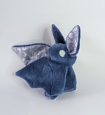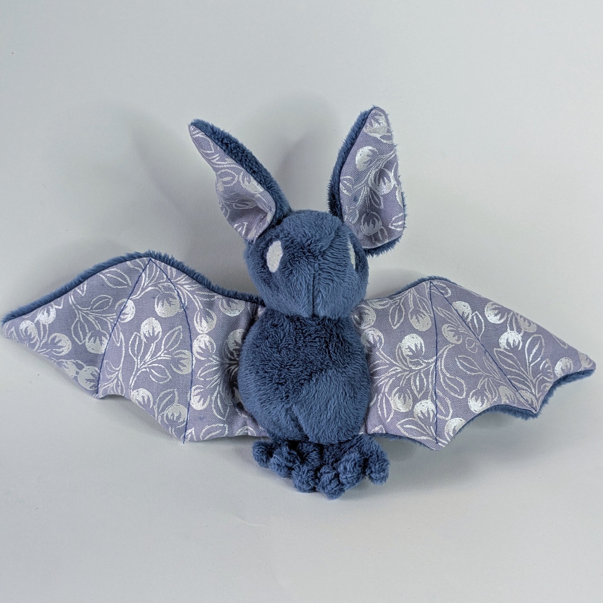 Small plush bat, dark blue with silver and gray floral pattern. Felt eyes - no choking hazard (~10 inch wingspan, ~4 inches tall)