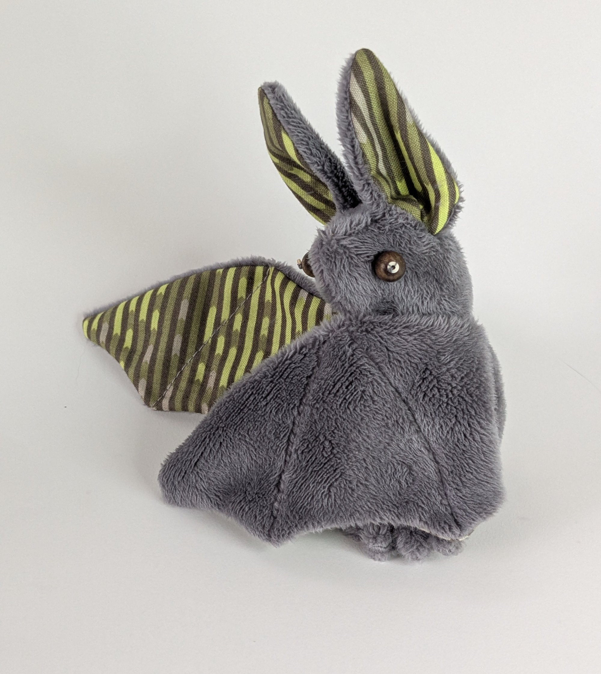 Small plush bat, gray and yellow stripe pattern. Wooden bead eyes (~10 inch wingspan, ~4 inches tall)
