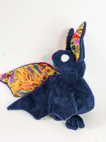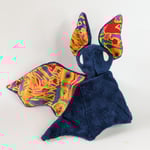 Large plush bat, midnight blue with colorful abstract print. Felt eyes, no choking hazard. (~15 inch wingspan, ~6 inches tall)